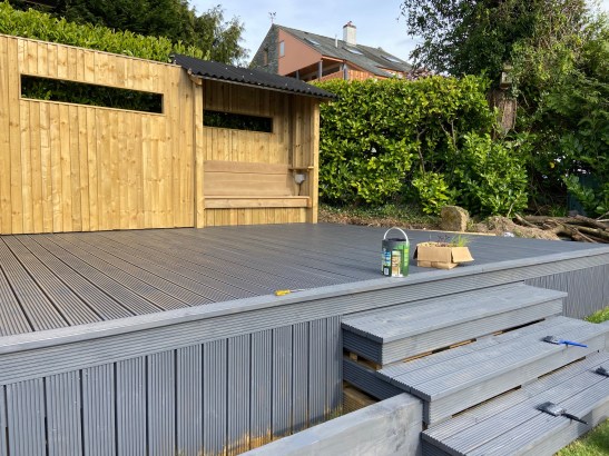 Lockdown project at home: a big decking with flowerbeds around the steps and a sheltered seat. Stained with Cuprinol non-slip in urban grey. Dog enjoying the company…